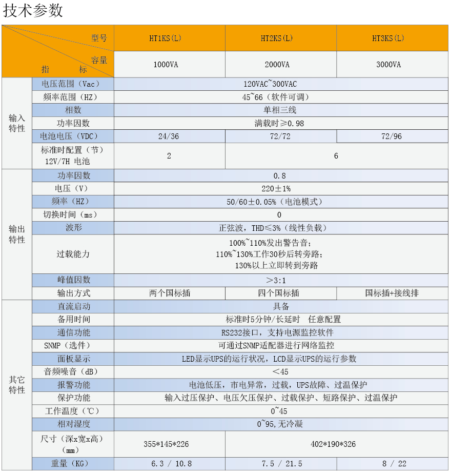 HT 1Kva-3Kva 1P 系列UPS*高效可靠:超宽电压输入范围,有效减少转电池放电次数,延长电池寿命;在线式双变换技术,供电稳定可靠;*智能管理:可选SNMP/MODBUS/USB等通讯方式;支持延长关机,适时安全关闭计算机应用系统及操作系统;开机自诊断功能,及时发现UPS隐性故障,防患于未然;可选手机APP、微信远程管理、短信报警灯多种报警上报方式;*易用灵活:LCD显示,友好人机界面,实时监控,操作便捷;标准机内置电池,方便易用。
